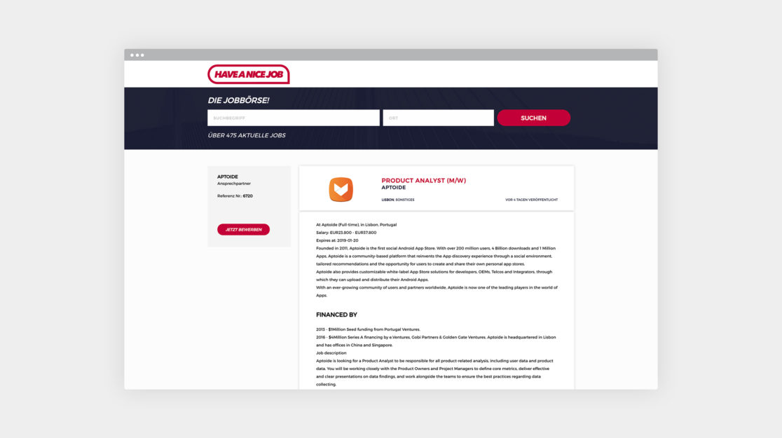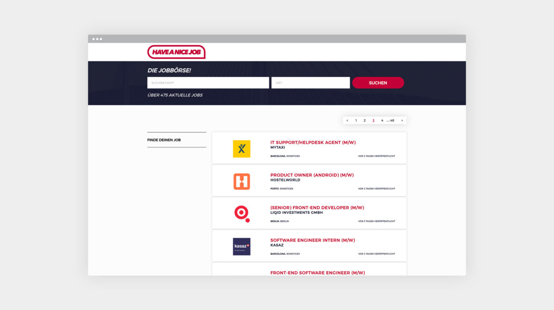 „Have a nice job“ ist die neue Jobbörse neben Stepstone, Monster und Co, die mit einem frischen und jugendlichem Design aufwartet. Leitschiff entwickelte das Corporate Design der Jobbörse „Have a nice job“ von Grund auf und etablierte so eine junge und dynamische Marke auf dem digitalen Stellenmarkt. Suchen Sie einen neuen Job? Hier finden Sie Ihn: Have a nice job!